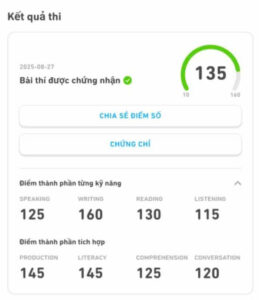 Đạt điểm cao trong Duolingo English Test không phải là chuyện may mắn. Đằng sau thành tích 135 điểm tổng và 160 điểm Writing là sự kiên trì rèn luyện, tinh thần kỷ luật và nỗ lực không ngừng nghỉ của học viên.